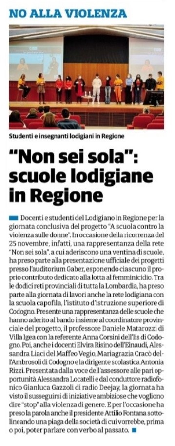 “Non sei sola”: scuole lodigiane in Regione Pubblicato alle 19:09 di domenica 28 Novembre 2021 in Rassegna Stampa Qualcosa non è accessibile? faccelo sapere × Questo contenuto ti è stato utile? Pessimo Non buono Sufficiente Buono Ottimo! Hai suggerimenti per migliorarci? Ai sensi dell’art. 13 del Regolamento UE 2016/679 GDPR ho preso visione dell’informativa di questo Istituto Invia Qualcosa non è accessibile? faccelo sapere